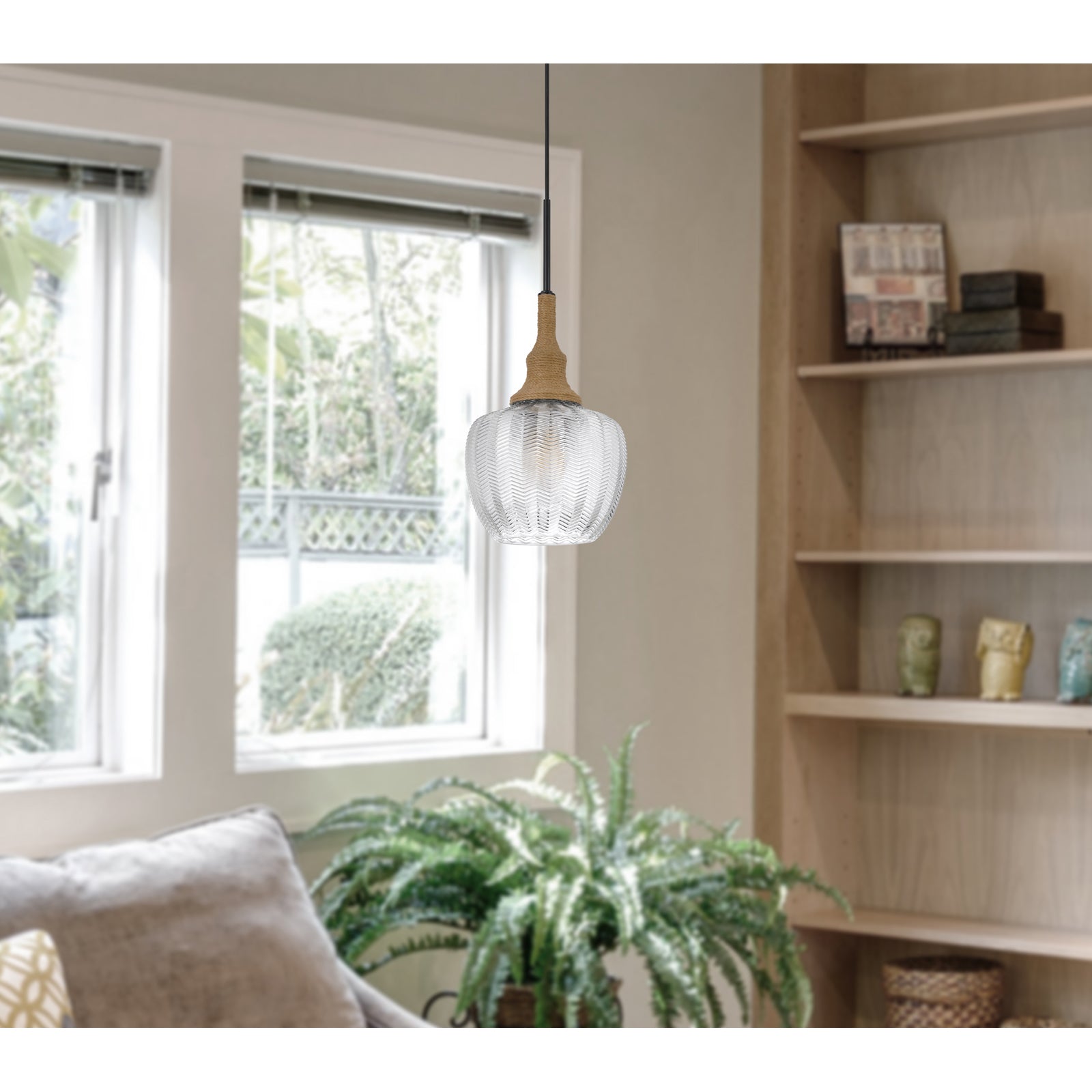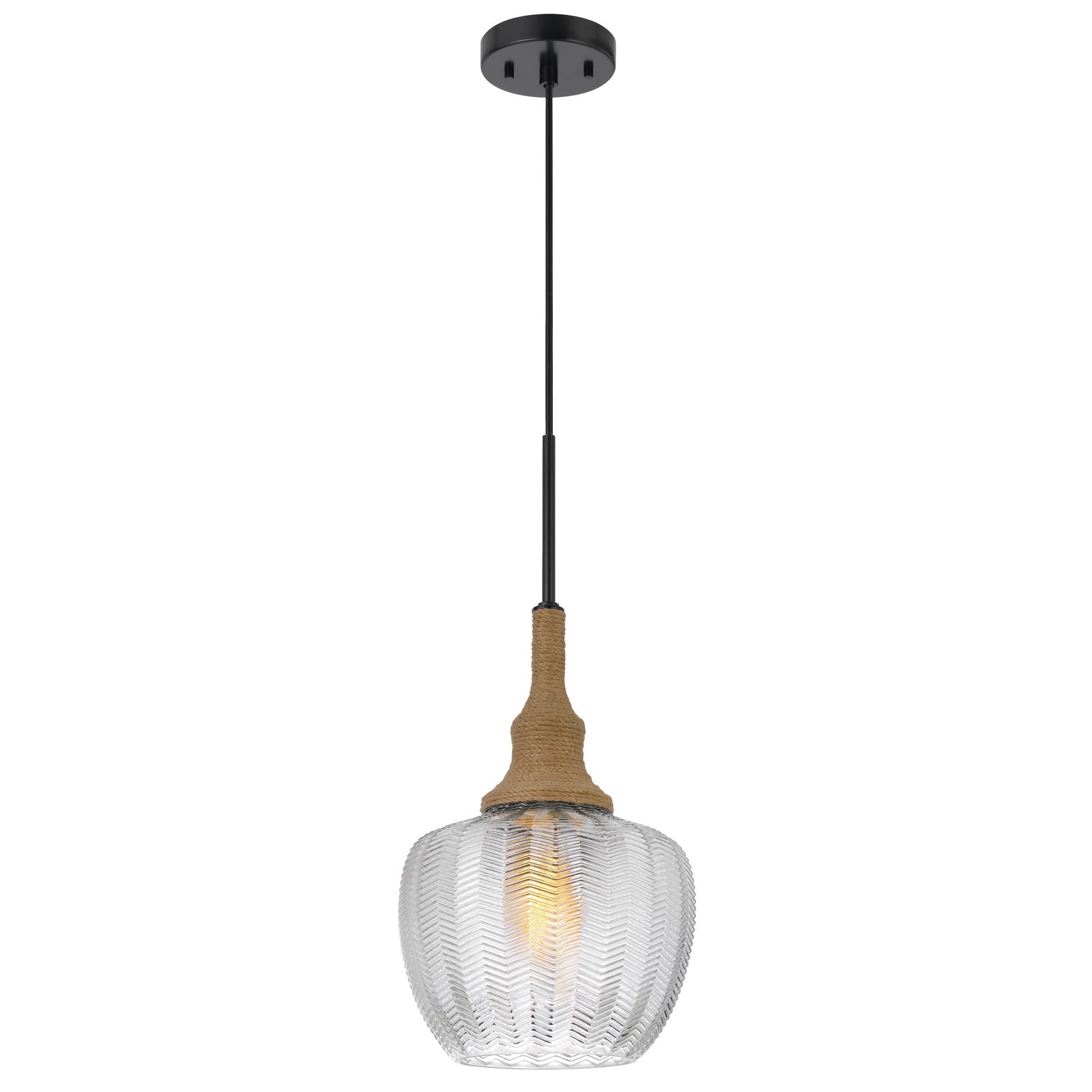 The Monroe 60W Glass Pendant Light with Burlap Roped Font is an elegant mini pendant fixture that seamlessly blends durable metal and glass construction with rustic charm. This hardwired lighting solution requires one E26 base bulb (not included) with a maximum wattage of 60W. Measuring 12.80 inches in length and width, and 15.50 inches in height, it features a stylish 72-inch black cord for easy installation. Perfect for enhancing the ambiance in your kitchen, bedroom, or living room, this pendant adds a touch of sophistication to any space while incorporating braided burlap accents for added texture. Ships in one carton with a canopy included, it requires only minor assembly and comes with a one-year warranty against defects in material and workmanship.