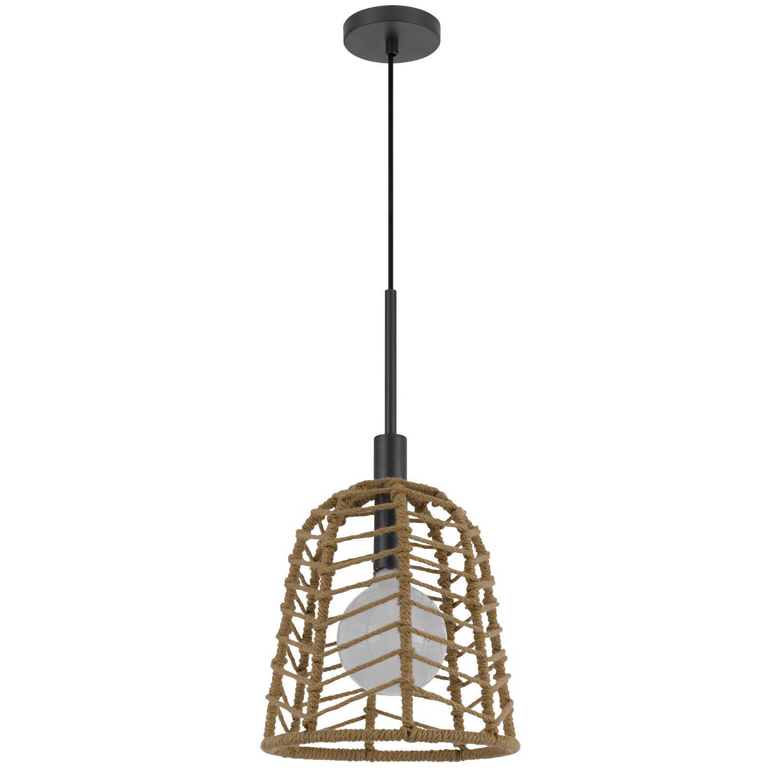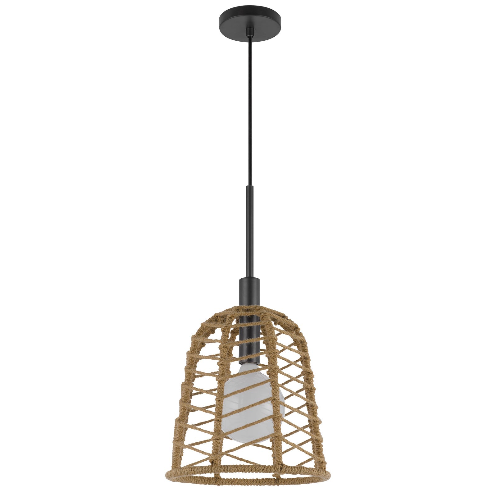 The Parkton 60W metal pendant light with burlap roped shade is a striking addition to any space, combining durability and style. This hardwired fixture features robust metal construction and a unique braided burlap shade that enhances its caged bell design. It comes with a 72-inch black cord and a canopy for easy installation. The pendant requires one E26 base bulb (not included) with a maximum wattage of 60W. Designed for minor assembly, this pendant light ships in one carton and is backed by a one-year warranty against defects in material and workmanship.