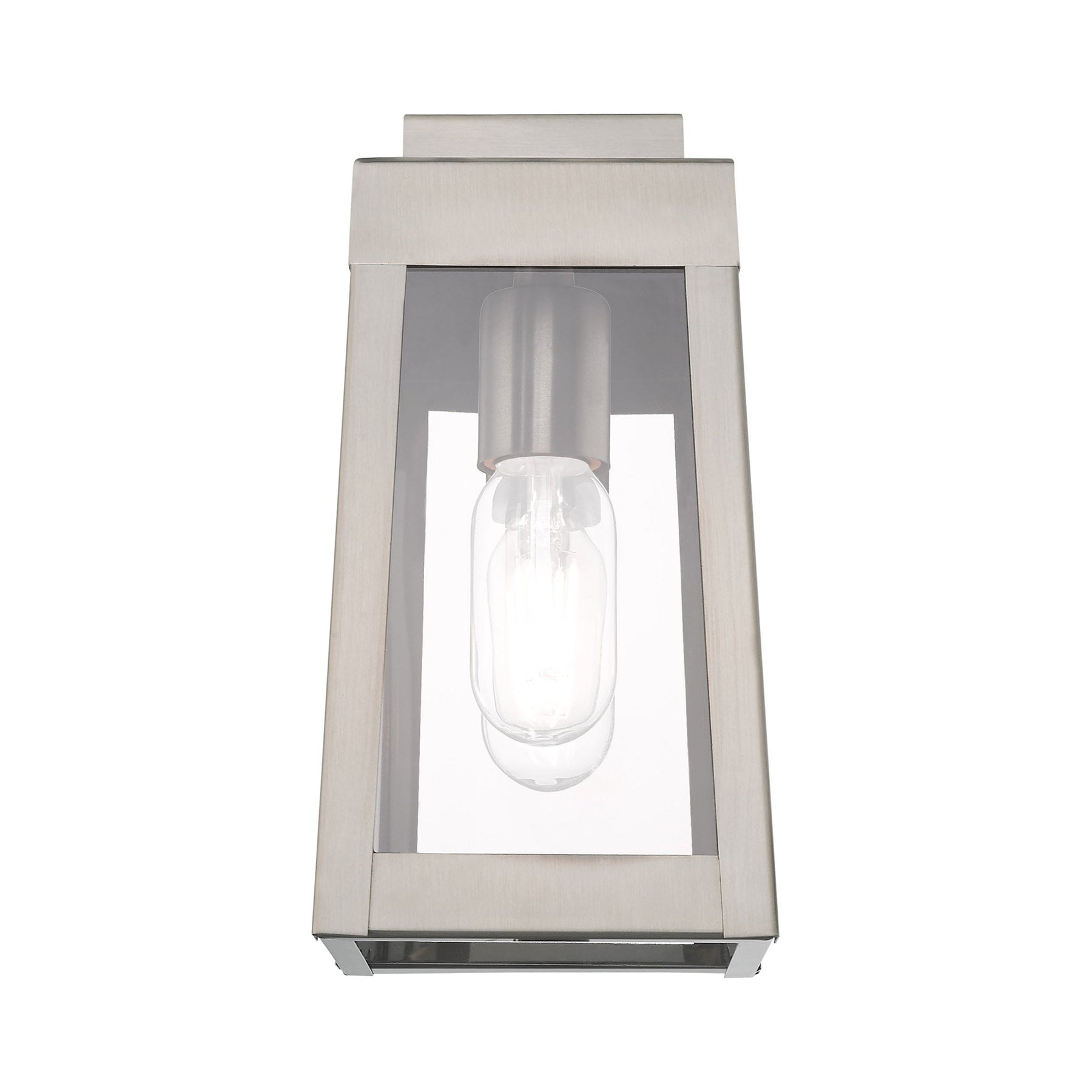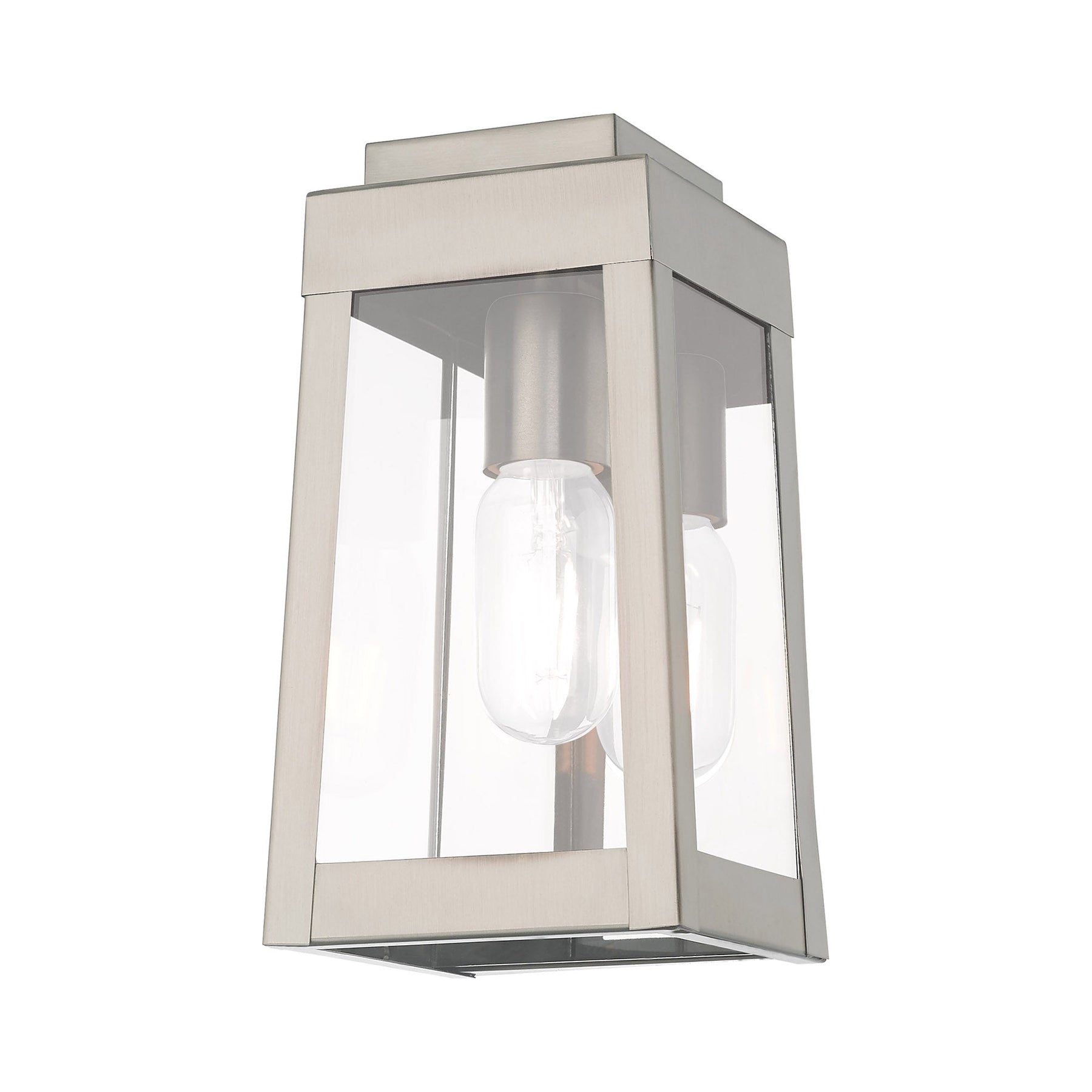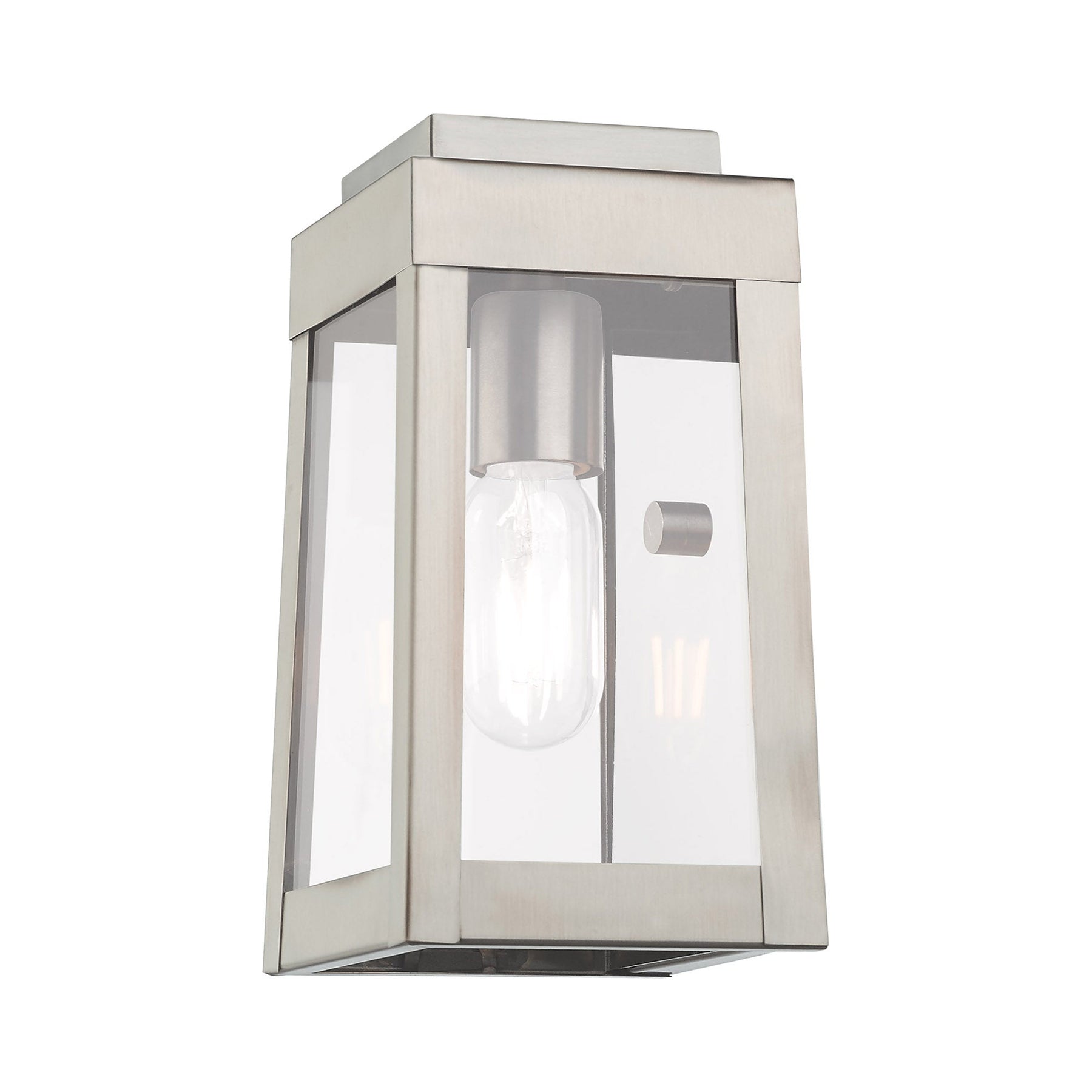 The 20851-91 Oslo Outdoor Wall Lantern showcases a modern industrial design with its brushed nickel finish and solid brass construction. Measuring 5 inches in width and 9.5 inches in height, this fixture extends 5 inches from the wall and features clear glass panels that enhance its sleek aesthetic. Designed to accommodate one medium base bulb with a maximum wattage of 100W, this lantern is suitable for both damp and wet locations, making it a versatile choice for outdoor settings. The hand-crafted detailing adds a unique touch to the fixture, ensuring durability and style in any outdoor space.