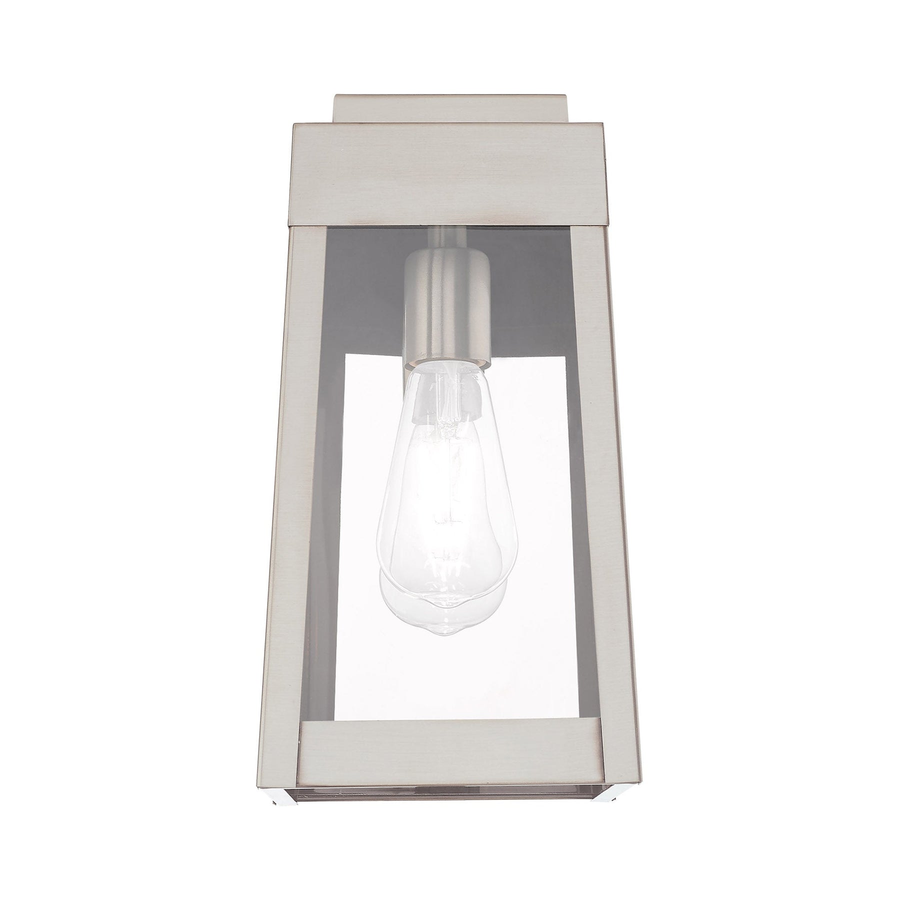 The Oslo Outdoor Wall Lantern, item number 20852-91, showcases an updated industrial design with a sleek tapered frame made of solid brass in a brushed nickel finish. This fixture features clear glass panels that enhance its modern aesthetic. Measuring 6.25 inches in width and 12 inches in height, with a 6.375-inch extension, it requires a single medium base bulb with a maximum wattage of 100W (not included). Crafted for durability, this hand-crafted outdoor fixture is suitable for both damp and wet locations, making it a perfect choice for enhancing the exterior elegance of your home.