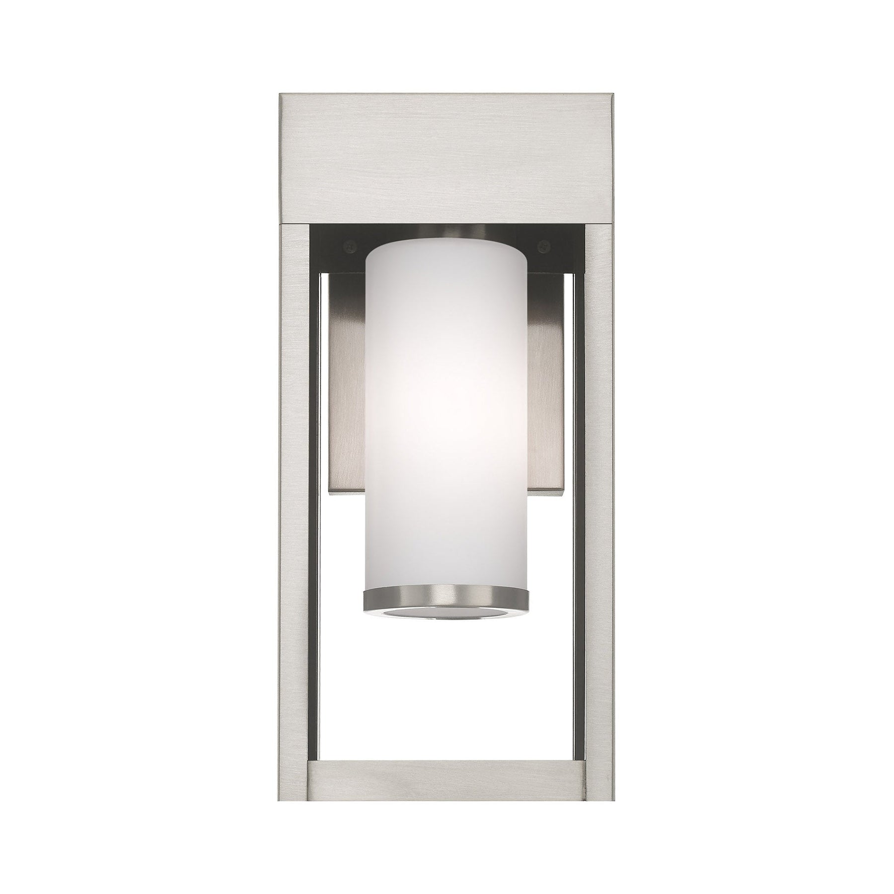 The Bleecker Outdoor Wall Lantern, model number 20982-91, combines sturdy craftsmanship with a contemporary design. Made from solid brass and finished in brushed nickel, this lantern features a hand-blown satin opal white cylinder glass shade, offering a sleek look. Measuring 6.25 inches in width and 13.625 inches in height with a 5.625-inch extension, it accommodates one medium base bulb with a maximum wattage of 60W. Rated for both damp and wet locations, this fixture is perfect for adding stylish illumination to outdoor spaces.