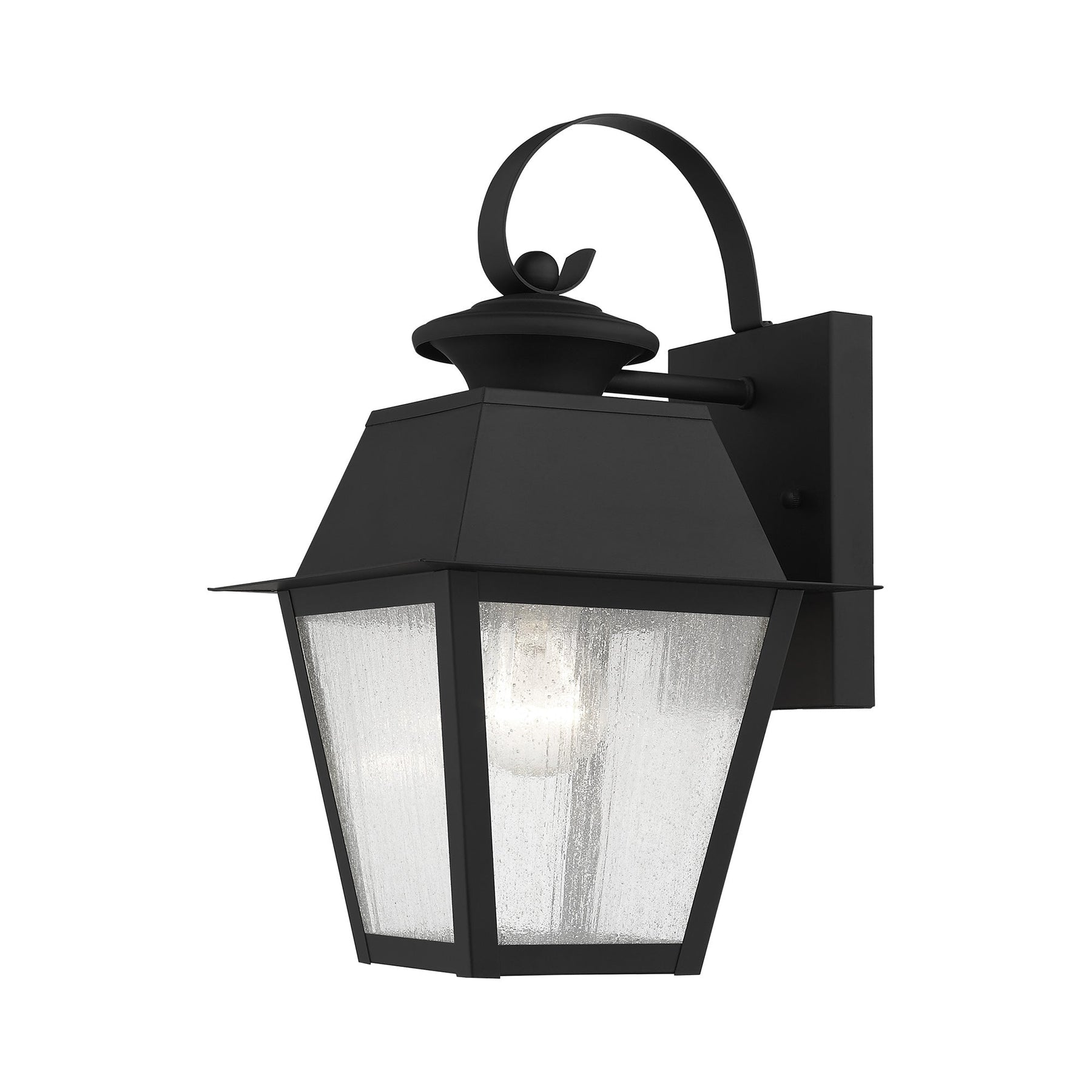 The Mansfield Wall Lantern, item number 2162-04, is a stunning addition to any outdoor space, combining traditional elegance with practical design. Measuring 7.5 inches in width and 12.5 inches in height, this wall sconce features a sleek black finish and is crafted from hand-made solid brass. The beautiful seeded glass shade enhances the light's diffusion, while the fixture accommodates one medium base bulb with a maximum wattage of 100W (bulb not included). With an 8.5-inch extension, it is perfect for illuminating driveways, porches, or entryways. This lantern is rated for both damp and wet locations, making it highly suitable for various outdoor settings.