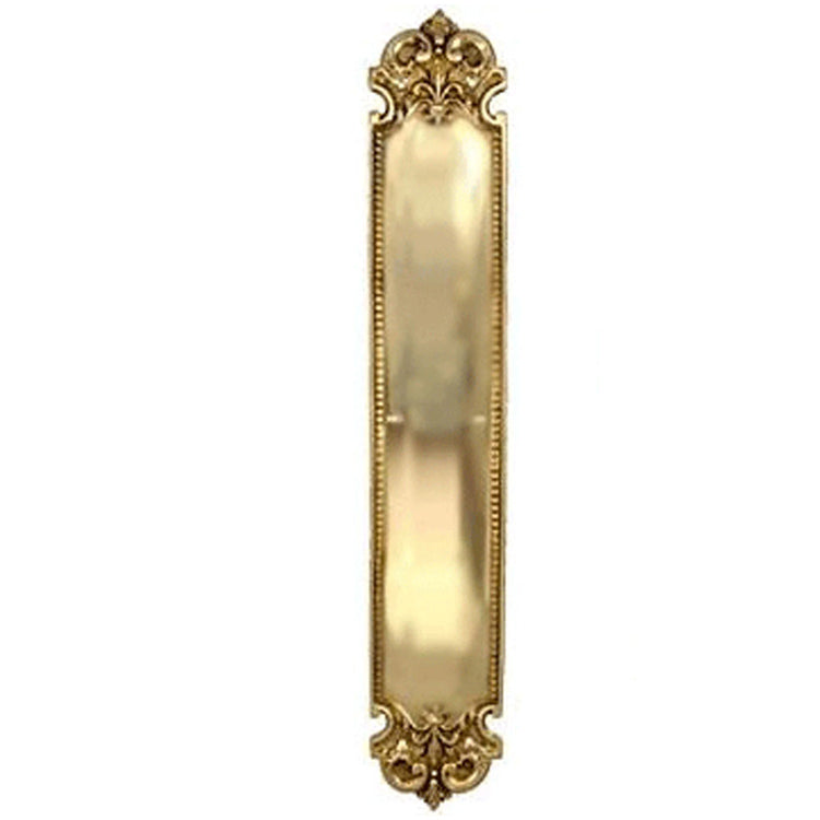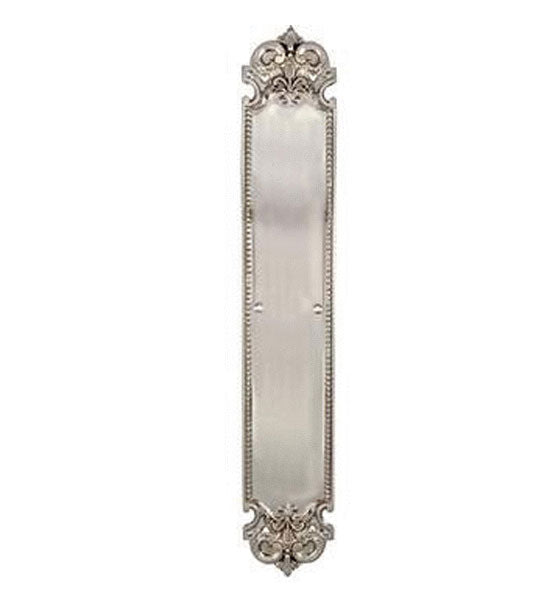 Fleur-De-Lis Style Door Push & Plate. Measures 3 Inches wide by 18 Inches tall. Solid Brass construction for decades of service. Comes complete with mounting hardware.
