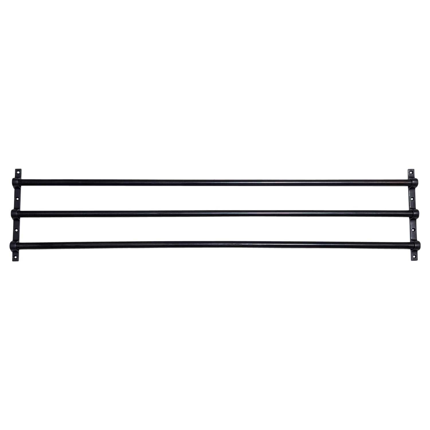 This triple push bar is finished in polished brass and is made from solid brass material. Measures approximately 37 inches overall (including brackets). Each tube is made from solid brass material and measures 36 inches long and 5/8 inch in diameter.