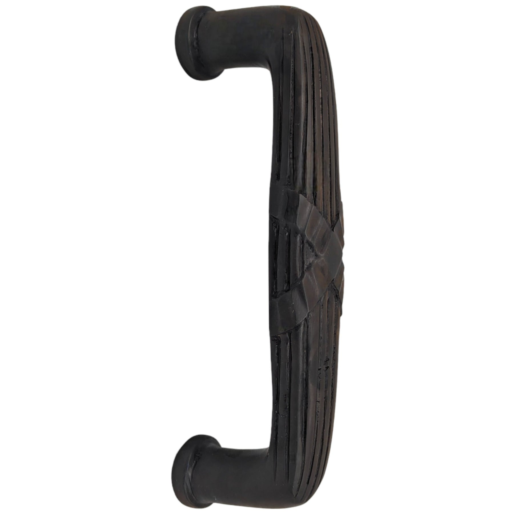 This pull measures approximately 7 inches long with a center to center measurement of 6 inches. The pull is crafted from solid brass, this detailed hardware piece comes complete with bolts, ensuring easy installation with all the necessary mounting hardware included. It is advisable to install a push plate on the other side of the door to conceal the bolts.