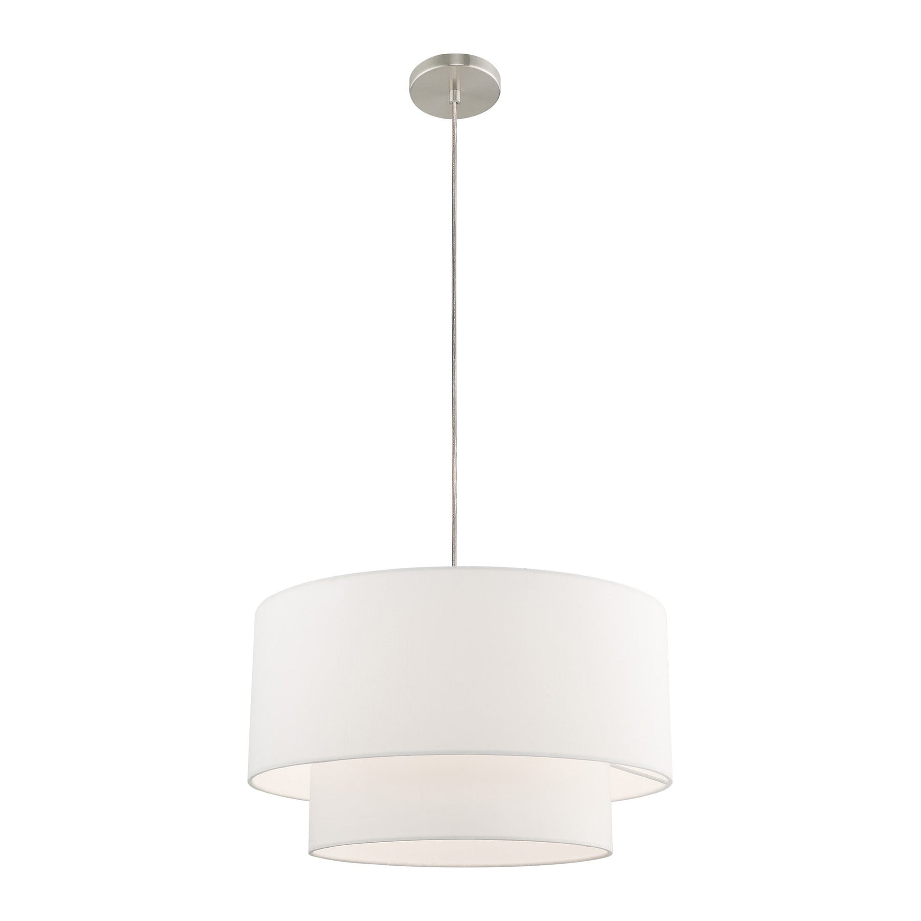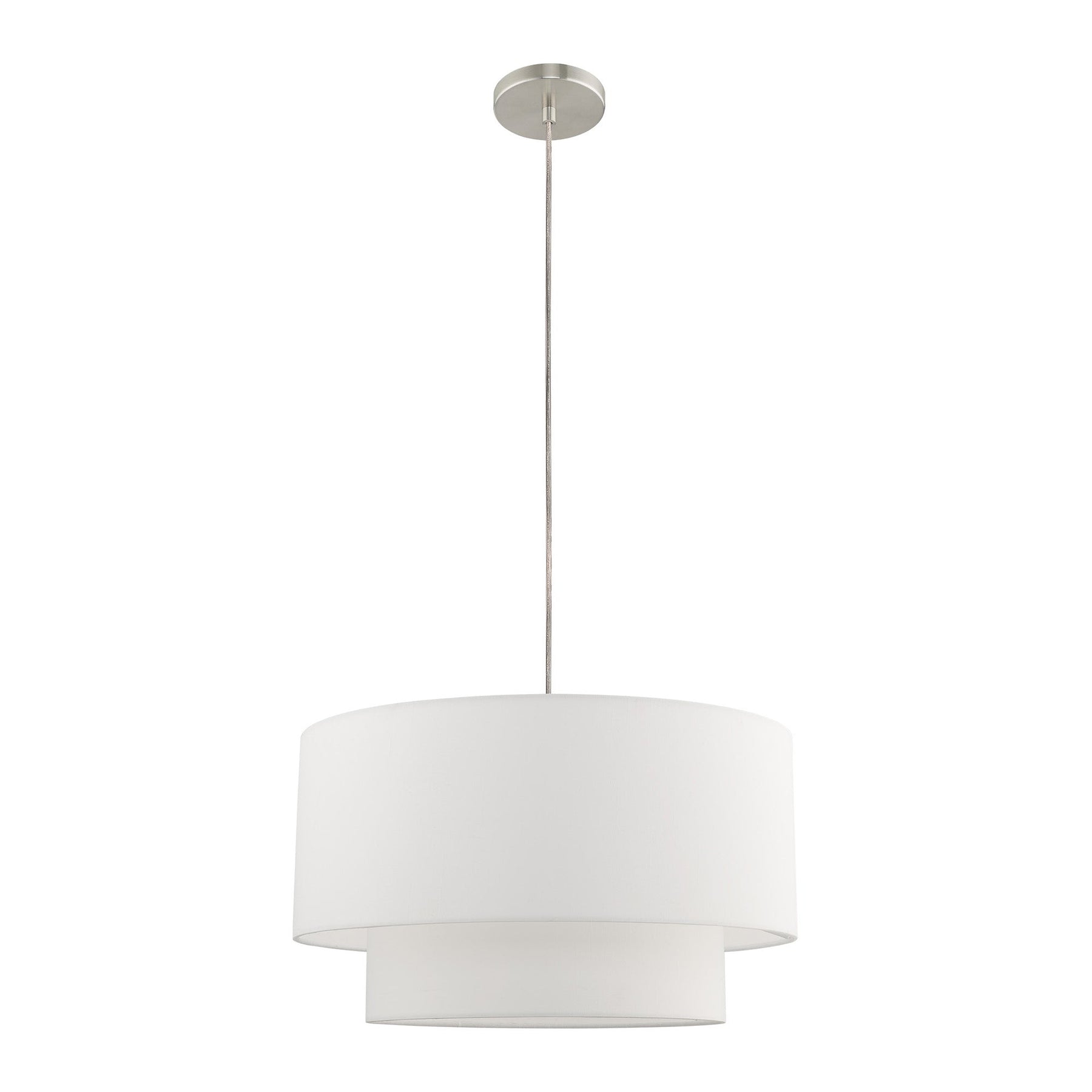 The 41098-91 Meridian Pendant Chandelier features a transitional design that effortlessly combines elegance and simplicity. Its brushed nickel finish frame supports a handcrafted off-white fabric hardback shade, creating a light and airy aesthetic. With adjustable height options ranging from 15 inches to 99 inches and a diameter of 20 inches, this chandelier perfectly suits a variety of spaces. It accommodates one medium base bulb with a maximum wattage of 100W, ensuring ample illumination. Designed for damp locations, it is not suitable for wet environments, making it an excellent choice for kitchens and dining areas.
