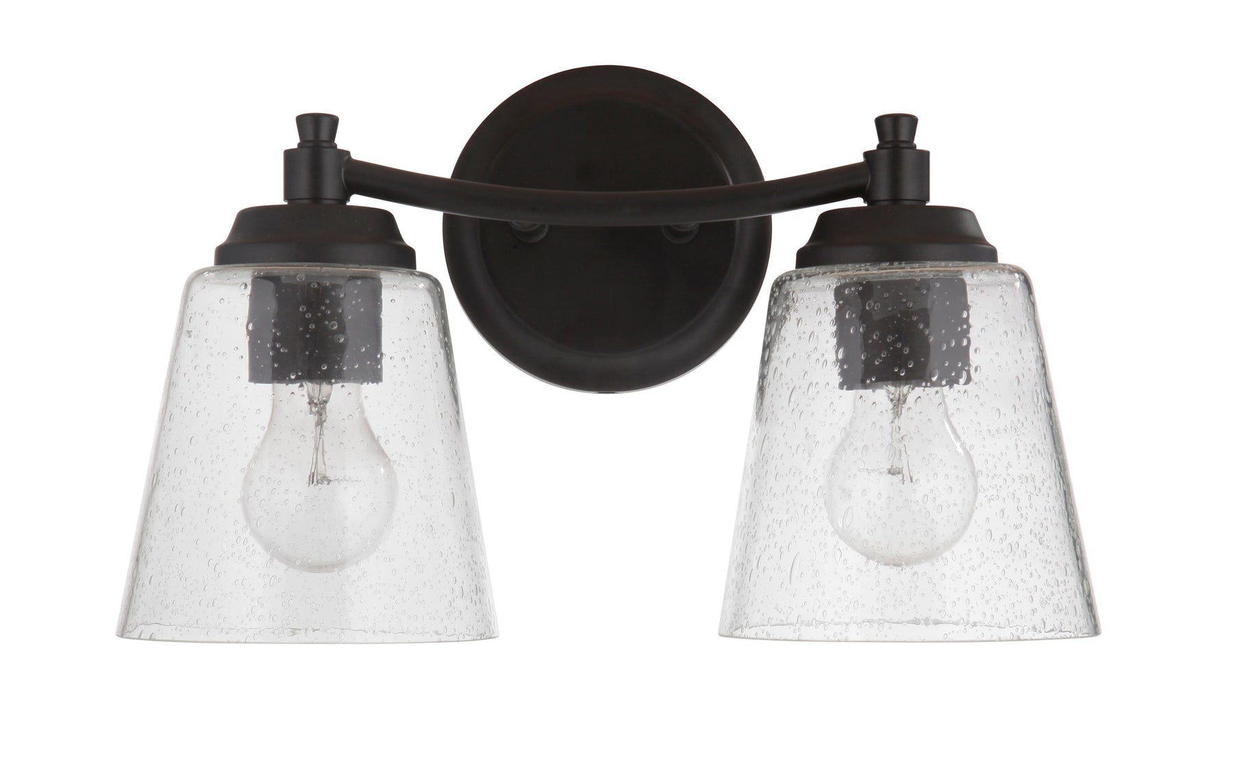 The Tyler 2 Light Vanity in Flat Black offers a blend of simple elegance and modern functionality. This vanity light features two medium base E26 bulbs (not included) with a maximum wattage of 60W each, ensuring ample illumination for your space. Measuring 14 inches in width, 14 inches in depth, and 10 inches in height, it has a sleek extension of 7 inches. Designed for wall mounting, this fixture is damp rated, making it a great choice for bathrooms or other moist environments.