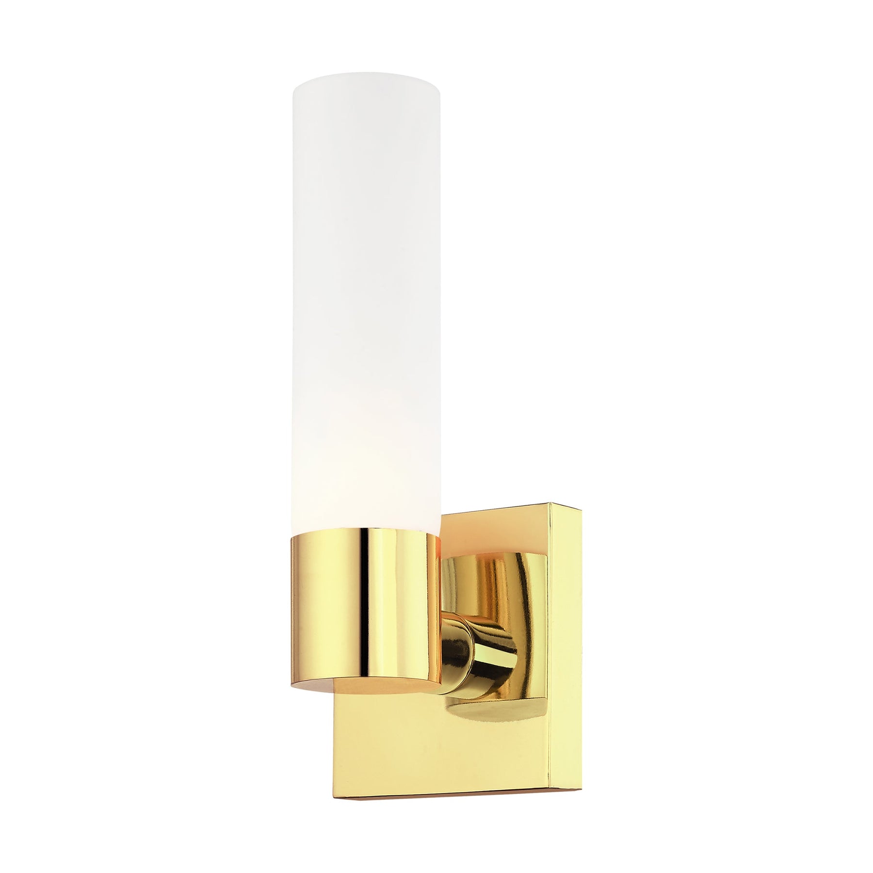 The Aero ADA Wall Sconce in Polished Brass offers a sleek and contemporary lighting choice for any space. It features a unique hand-blown satin opal white twist lock glass that beautifully diffuses light from a single candelabra base bulb (not included), with a maximum wattage of 60W. Measuring 4.5 inches in width and 11.25 inches in height, the sconce extends 4 inches from the wall, making it ideal for various settings. Additionally, it is suitable for damp locations, providing versatility for bathrooms and other humid environments.