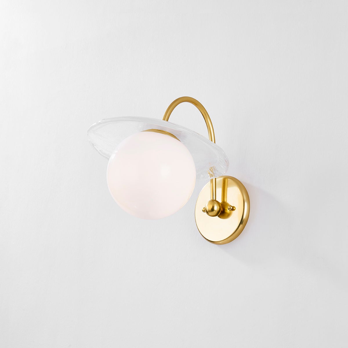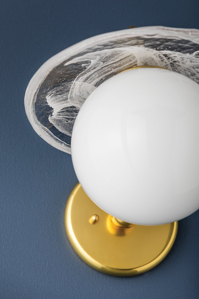 The STAMPFORD Wall Sconce from Hudson Valley Lighting is a striking addition to any interior space, offering a stylish blend of function and design. With a diameter of 10.75 inches and a height of 11.25 inches, this fixture boasts a striking Aged Brass finish. It has an extension of 12.50 inches and a top-to-center measurement of 8.50 inches, accommodating various placement options. This sconce requires one E26 medium base bulb with a wattage of 8.00 (bulb not included) and features a beautiful piastre glass shade that enhances its overall elegance. Designed for damp locations, this fixture is perfect for creating a warm ambiance in bathrooms or covered outdoor areas.