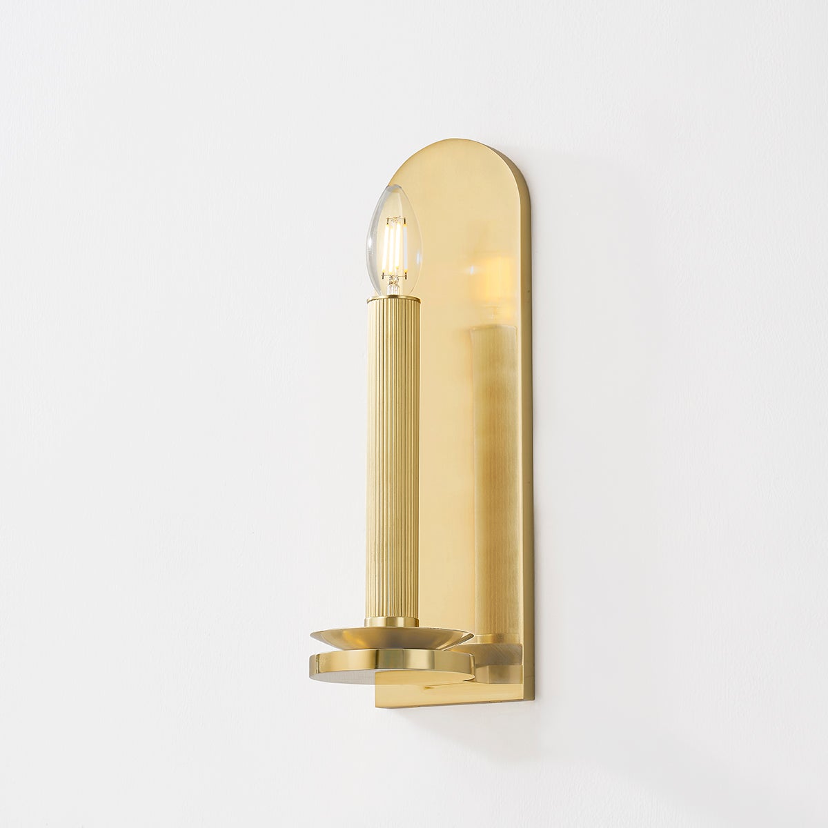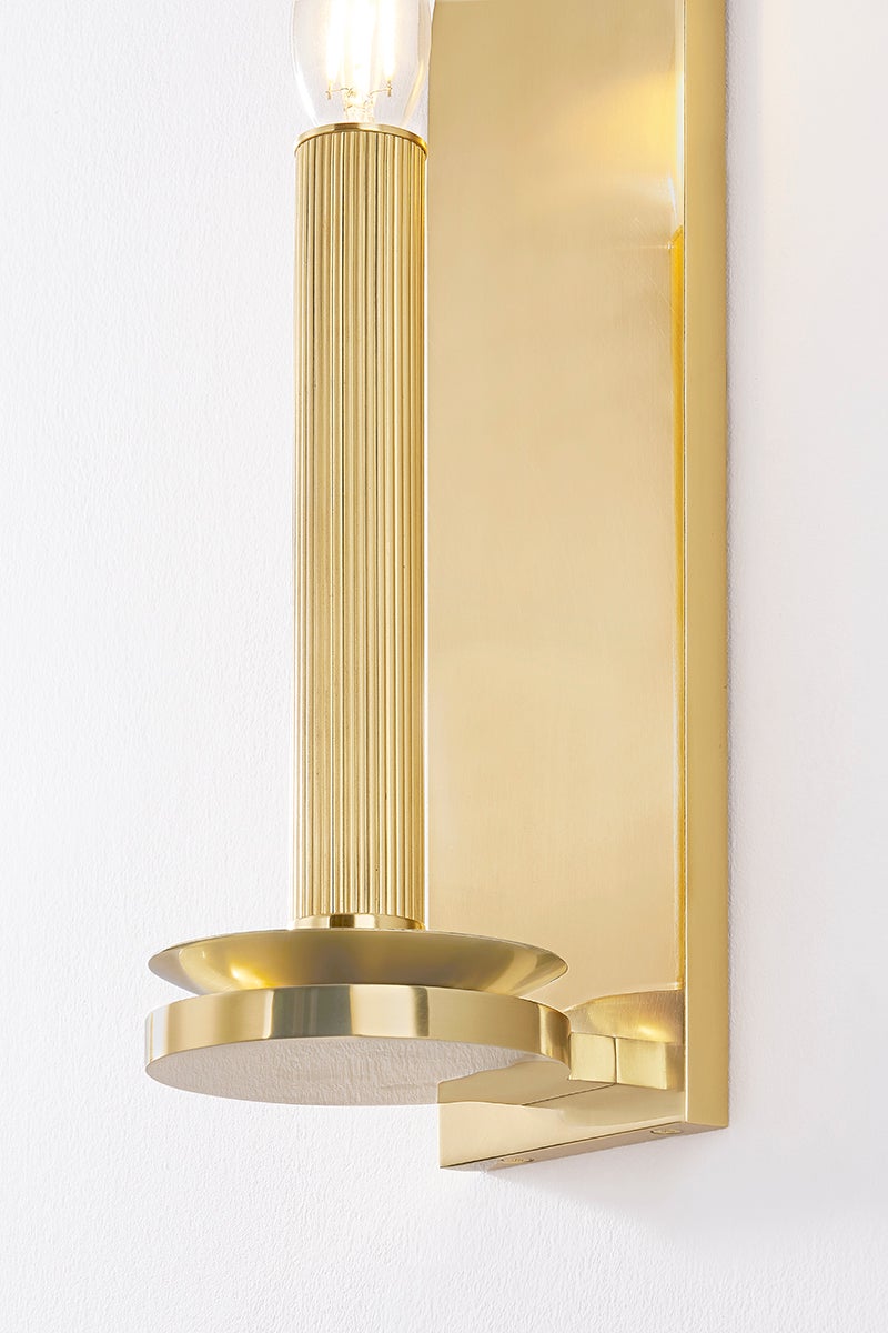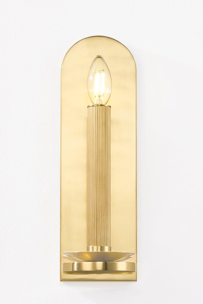 The Lindenhurst Wall Sconce by Hudson Valley Lighting combines elegant design with functional lighting. Measuring 4.25 inches in width, 14 inches in height, and extending 4.75 inches from the wall, this stylish sconce features a single E12 candelabra base socket. It supports a recommended B11 bulb with a wattage of 8.00, providing ample illumination. The sconce is finished in a sophisticated Aged Brass (AGB) and is UL Damp rated, making it suitable for use in bathrooms and other moisture-prone areas.