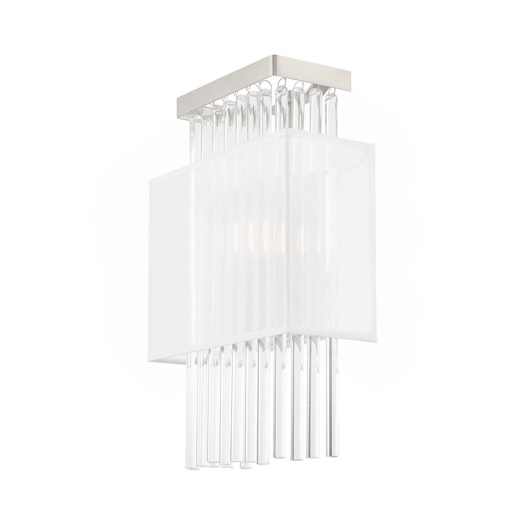 The Alexis Wall Sconce, item number 41140-91, offers a chic lighting solution that enhances contemporary decor with its upscale design. This elegant fixture features a brushed nickel finish and is adorned with stunning grade-A K9 crystal rods, providing a striking visual appeal. It requires one candelabra base bulb (not included) with a maximum wattage of 40W. With dimensions of 9 inches in width, 14.5 inches in height, and a 3.95-inch extension, the Alexis is suitable for damp locations, making it a versatile choice for various spaces.