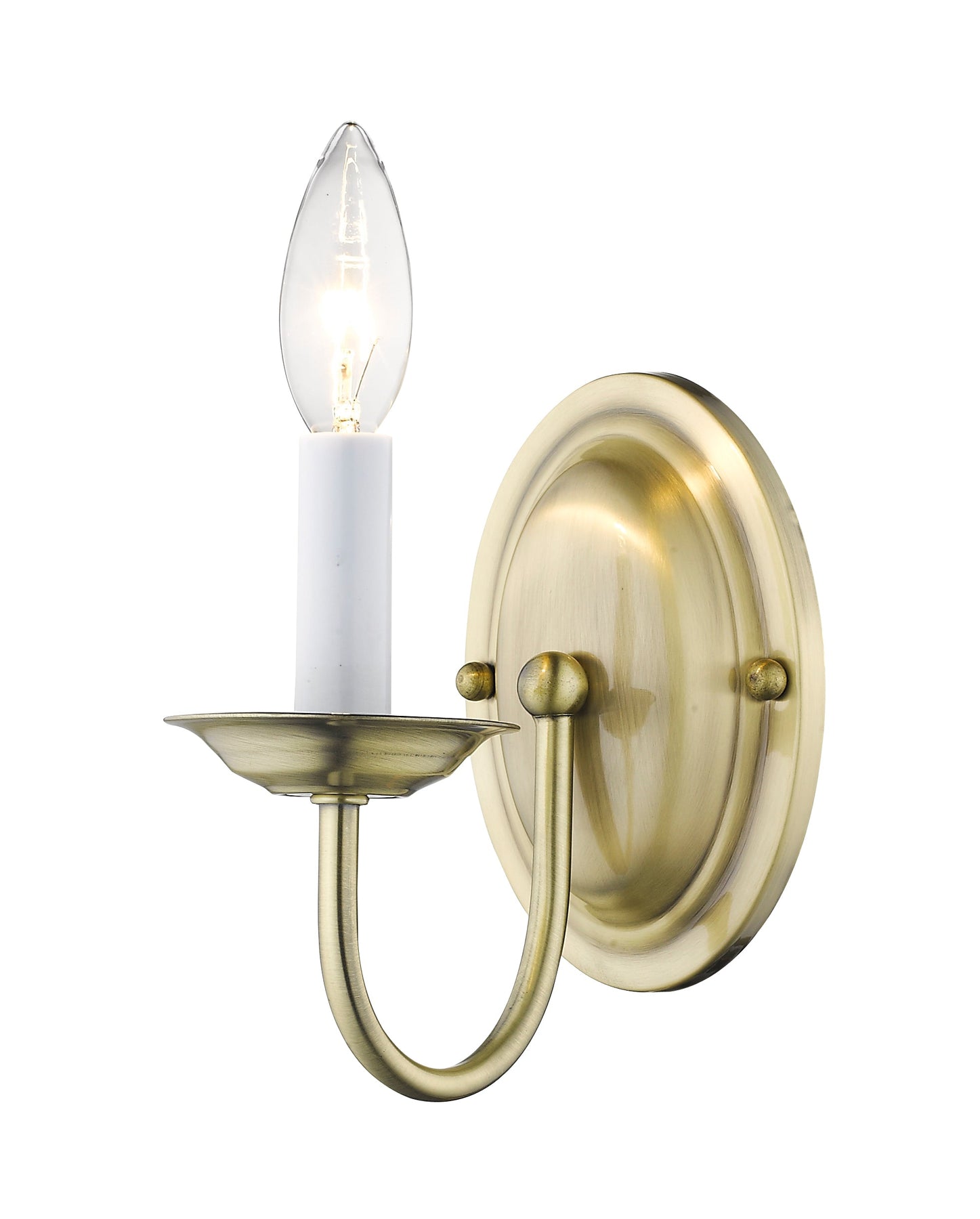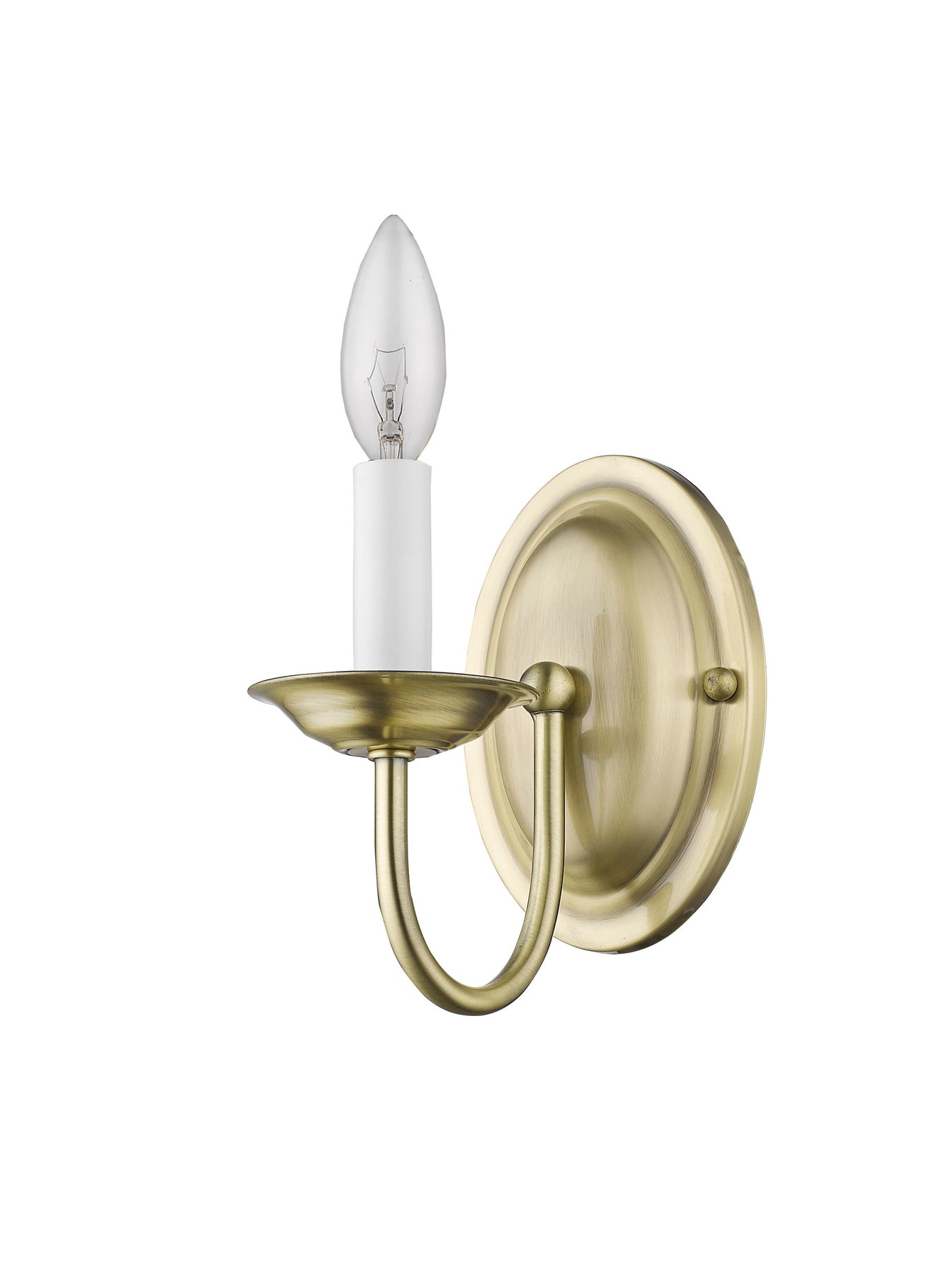 The 4151-01 Home Basics Wall Sconce is a stunning embodiment of transitional style, featuring a graceful sweeping arm and a rich antique brass finish. This elegant fixture measures 4.25 inches in width and 9.25 inches in height, with an extension of 6.5 inches. It requires one candelabra base bulb (not included) with a maximum wattage of 60W. Designed for damp locations, it adequately complements various settings while adding a touch of traditional charm.