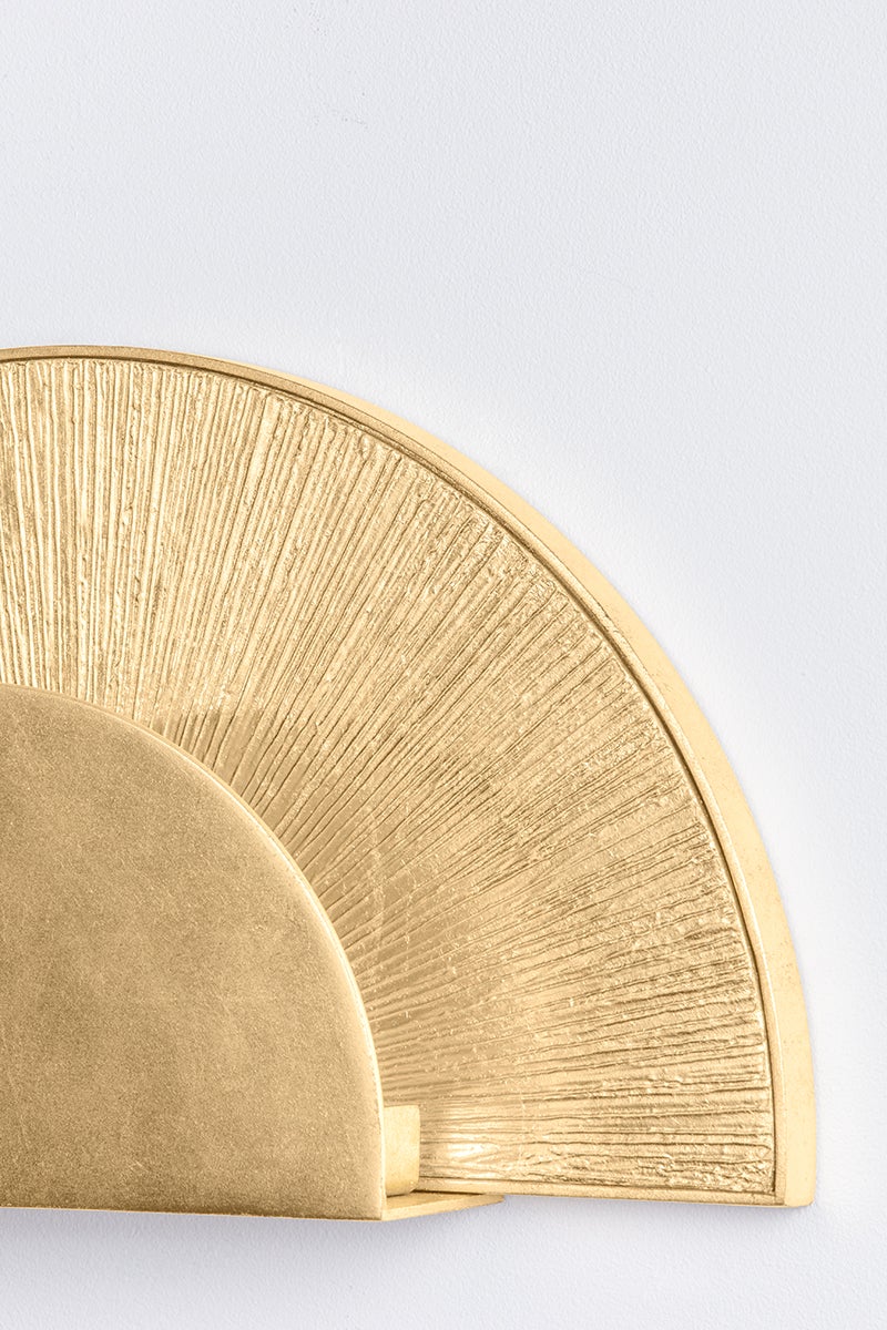 The HOMECREST Wall Sconce by Hudson Valley Lighting features a stunning Vintage Gold Leaf finish that adds a touch of elegance to any space. Measuring 13.75 inches in diameter and 7.50 inches in height, this sconce has a 2.50-inch extension and centers its light source at 4.25 inches. It incorporates an integrated LED socket, delivering a bright output of 575 lumens with a color temperature of 3000K and a color rendering index (CRI) of 90, ensuring vibrant and true-to-life colors. While it is not Title 24 compliant, it is field serviceable, providing convenience and ease of maintenance.