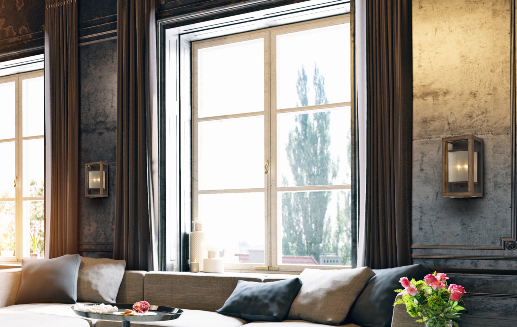 40W X 2 RUBBER WOOD WALL SCONCE WITH ORGANZA SHADE (EDISON BULBS NOT INCLUDED)